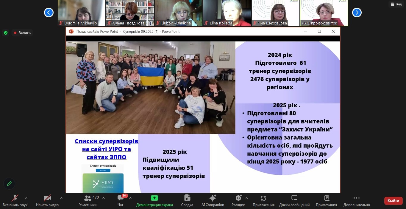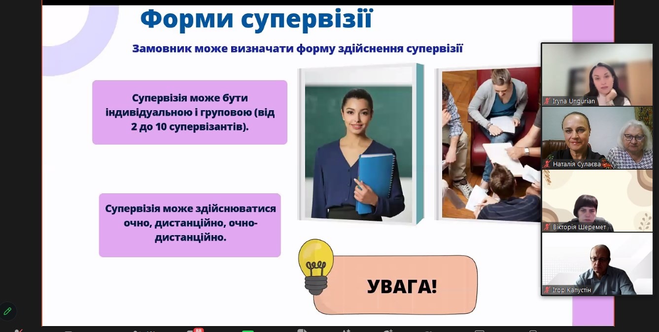 9 жовтня 2025 року викладачі кафедри музики імені Григорія Левченка професорка Сулаєва Наталія Вікторівна та доцентка Ірклієнко Вікторія Степанівна взяли участь у вебінарі «Супервізія для професійного зростання освітян» за участі експертів УІРО, супервізорів і представників ЗЗСО. Для України супервізія є інструментом професійного розвитку педагогів, майбутніх учителів мистецтва. До обговорення були запропоновані питання державної політики, історії досвіду супервізорів, супервізантів, керівників закладів освіти. Допомога педагогам ЗЗСО спрямована на професійну підтримку щодо розв’язування складних випадків, конфліктних ситуацій, розвиток професіійних навичок, що запобігає професійному вигоранню та забезпечує якість надання послуг. Вона базується на принципах довіри, конфіденційності і рефлексії.