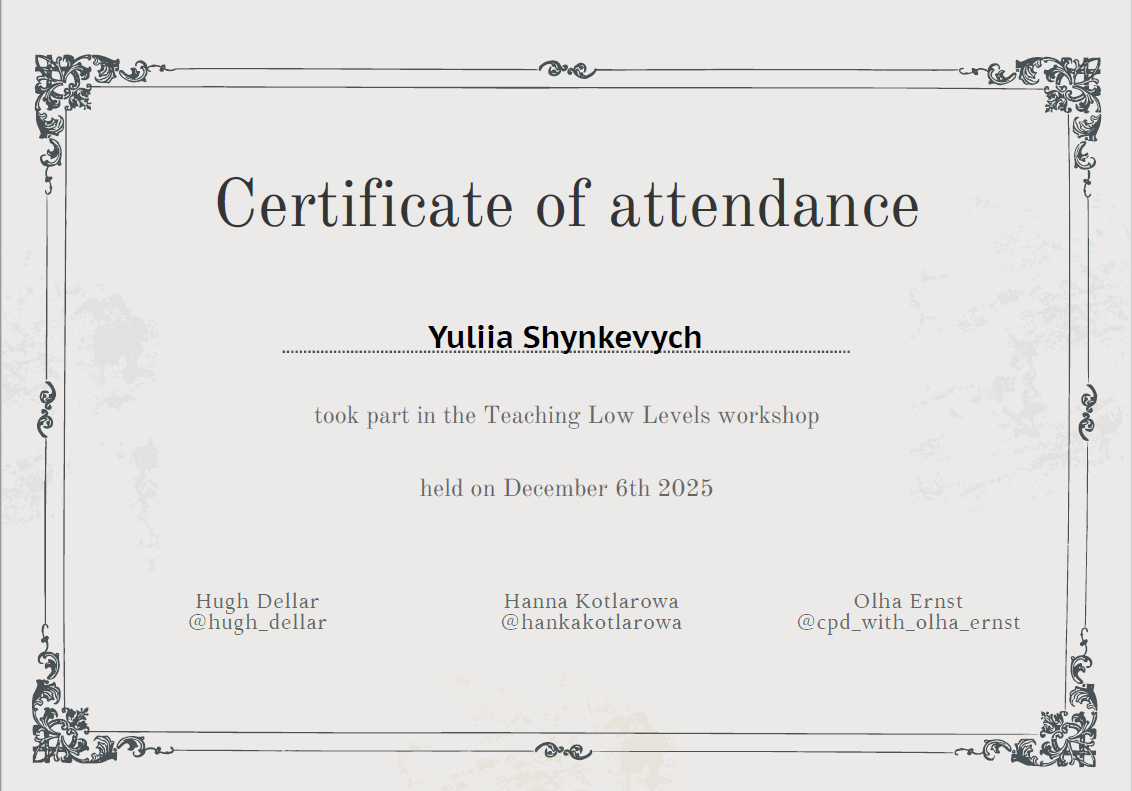Аспірантка кафедри початкової освіти ПНПУ імені В.Г. Короленка взяла участь у професійному воркшопі Teaching Low Levels, присвяченому методиці викладання іноземних мов на початкових рівнях володіння мовою (A1–A2), роботі з true та false beginners, а також розвитку навичок усного мовлення в учнів із низьким рівнем мовної підготовки.
