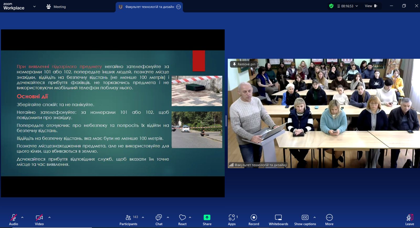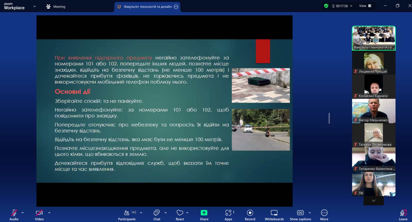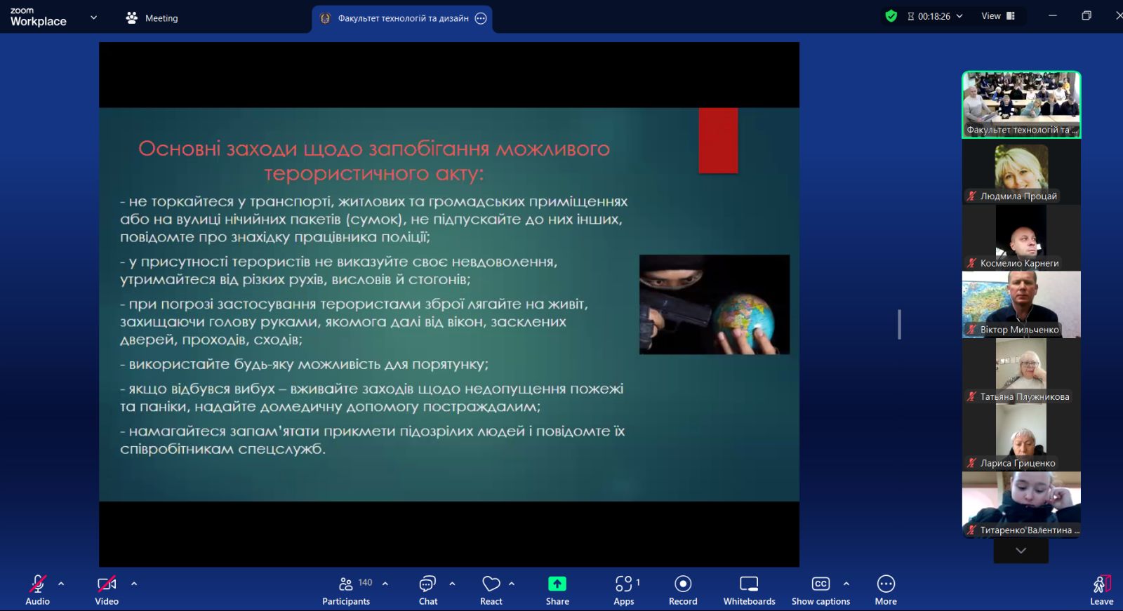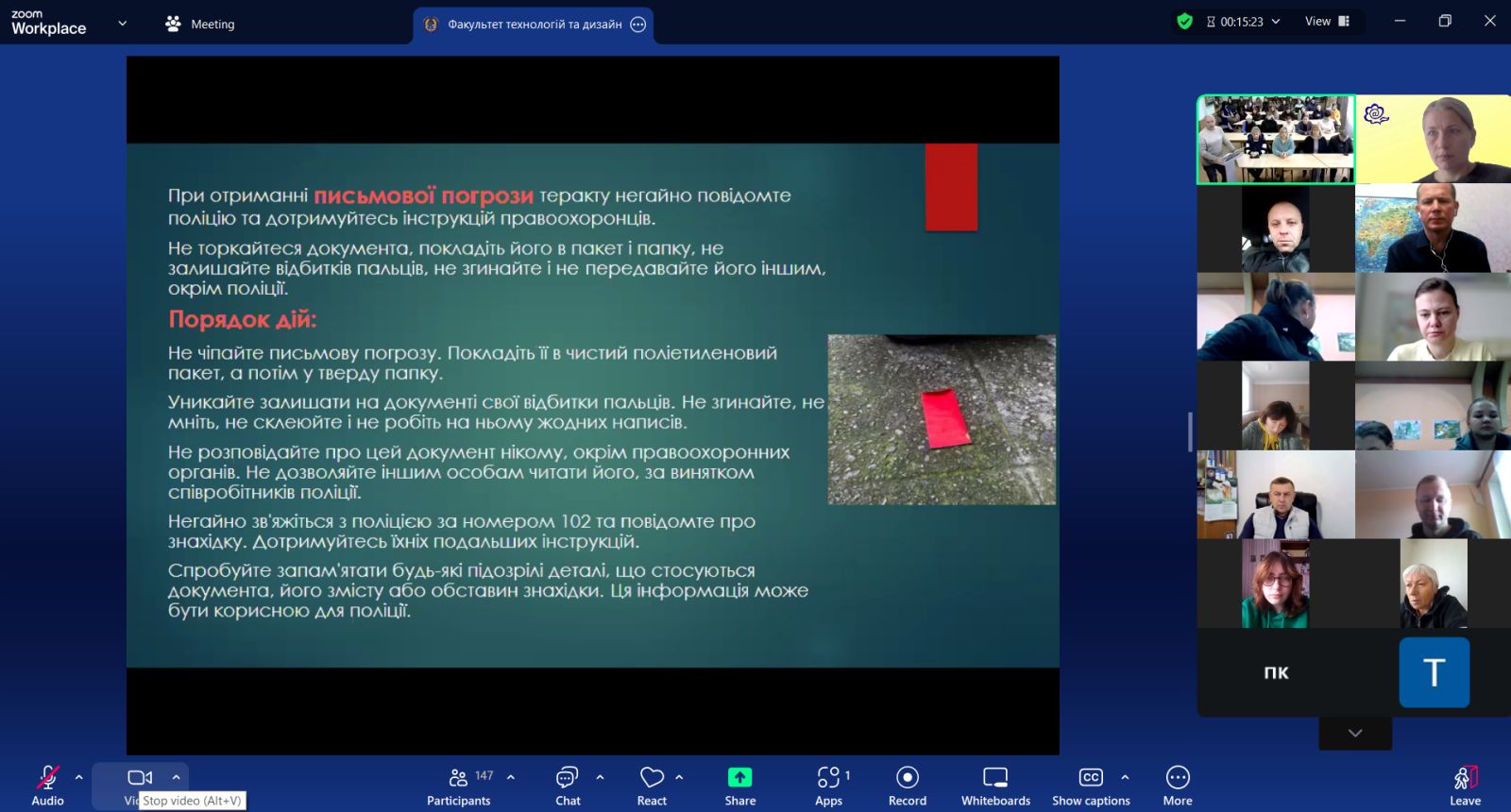 Під час заходу учасники ознайомилися з алгоритмом дій у разі виявлення підозрілих предметів чи отримання письмових погроз, правилами поведінки під час можливих терористичних загроз, а також із основними заходами безпеки, спрямованими на збереження життя і здоров’я студентів та працівників університету.