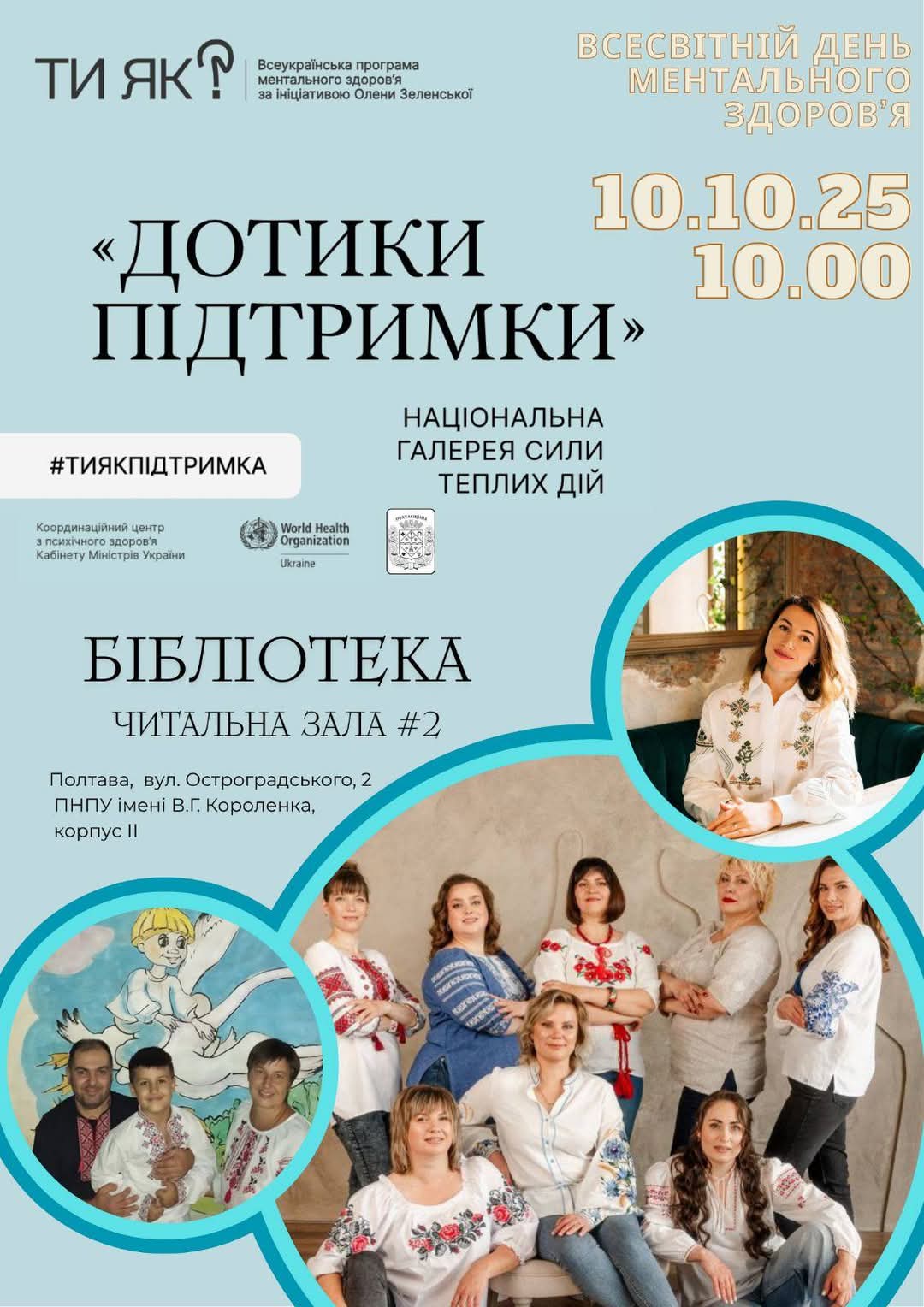 10 жовтня 2025 року, з нагоди Всесвітнього дня ментального здоров’я, викладачі та студенти факультету педагогічної і мистецької освіти долучилися до заходу «Дотики підтримки», що відбувся у Полтавському національному педагогічному університеті імені В. Г. Короленка. Ініціатива реалізована в межах Всеукраїнської програми ментального здоров’я «Ти як?», започаткованої Першою леді України Оленою Зеленською. Учасники мали змогу познайомитися з видатними діячами національної галереї сили теплих дій «Дотики підтримки» та надихнутися їхніми історіями людяності й взаємної підтримки.