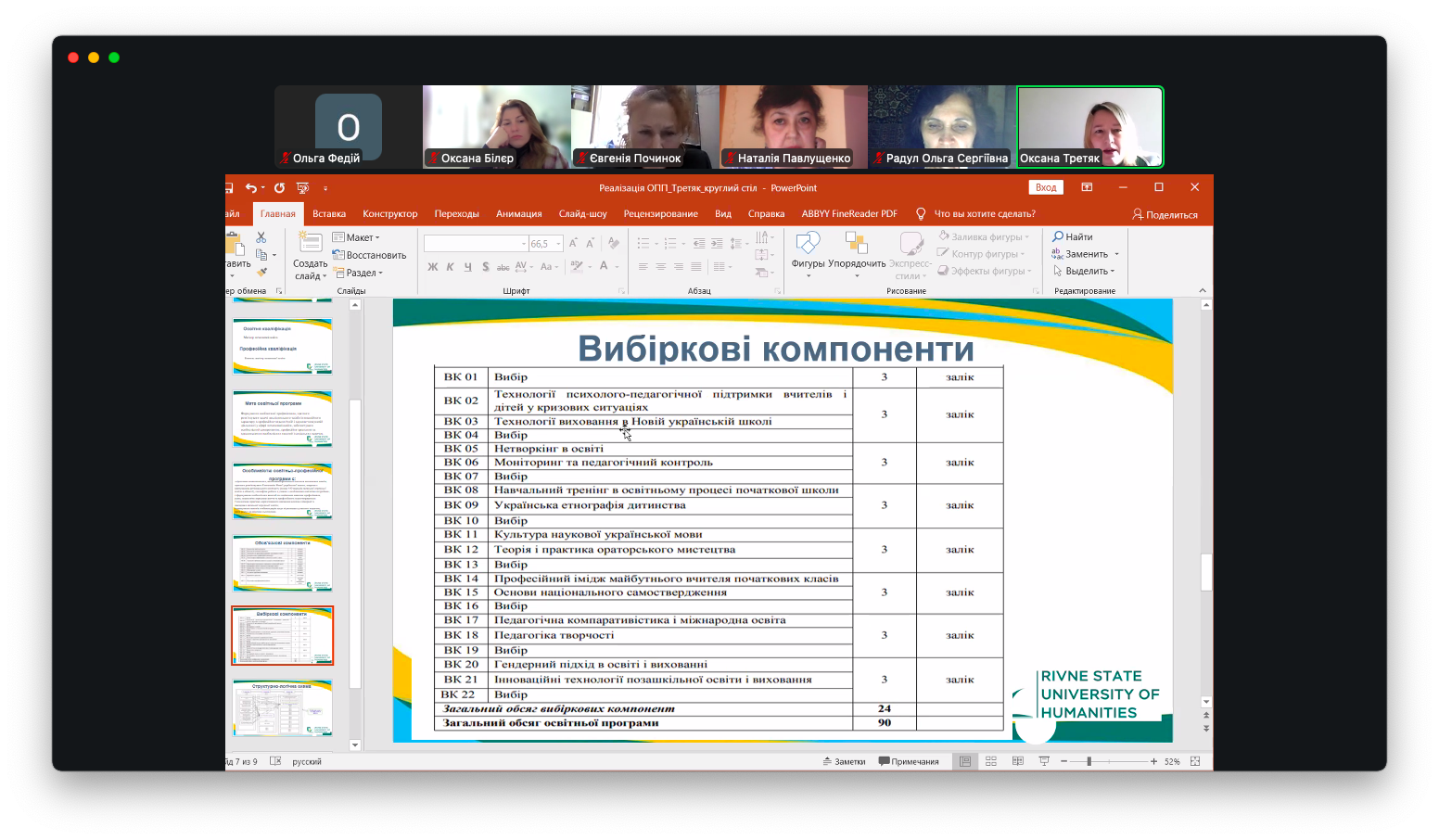У ході роботи круглого столу обговорювалися питання вдосконалення змісту й структури освітніх програм, узгодження програмних компетентностей та освітніх компонентів із вимогами оновлених Державних стандартів, а також інтеграції принципів інклюзивності та цифровізації у систему підготовки майбутніх учителів-магістрів початкової освіти. Під час дискусійного обговорення було наголошено на важливості систематичного оновлення ОПП відповідно до сучасних освітніх інновацій та викликів реформування української освіти, зокрема у контексті підвищення професійної готовності майбутніх педагогів до вирішення актуальних завдань початкової школи.
